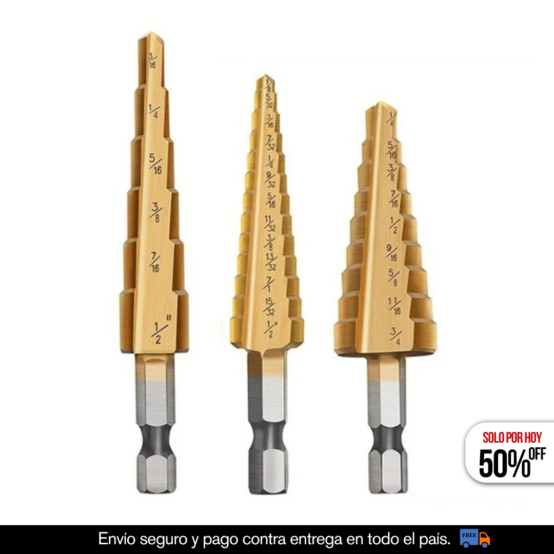 ✔️ Olvídate de cambiar brocas a cada rato. Con las brocas escalonadas haces varios diámetros en una sola pasada.